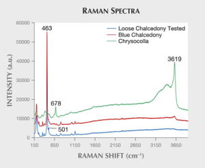 Gần đây, một lô Chalcedony rời đã được gửi đến Taiwan Union Lab of Gem Research (TULAB) để giám định. Những viên đá này được khách hàng gửi đi với tên gọi Chalcedony xanh dương tự nhiên, nhưng sau đó quang phổ Raman đã xác nhận chúng là Chalcedony không có các đỉnh đặc trưng của Chrysocolla (hình 1).