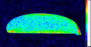 Với sự đồng ý của khách hàng, chúng tôi cắt một mẫu cabochon và đánh bóng mặt cắt ngang cho thấy một đới màu xanh dương từ bề mặt đến tâm và song song với nhau (hình 2). Mẫu được phân tích bằng EDXRF và bản đồ nồng độ trên mặt cắt ngang xác nhận rằng đồng tập trung trên bề mặt và giảm dần về phía bên trong, đây là bằng chứng mạnh mẽ cho việc nhuộm bằng muối đồng (hình 3).
