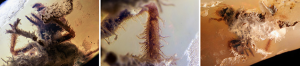 Hình 2. Một loài côn trùng chưa xác định bị bao phủ trong Opal. Hình bên trái: Phần đầu và miệng có thể nhìn thấy cùng với một số chân được bao phủ bởi các cấu trúc giống như lông, hay còn gọi là lông cứng. Chân ở phía trước đã bị cắt đi một phần trong quá trình đánh bóng. Trường nhìn 6.39 mm; Hình giữa: Lông cứng phân nhánh từ chân; trường nhìn 2.57 mm; Hình bên phải: Có thể nhìn thấy phần ngực của con côn trùng, mặc dù bị biến dạng một phần. Lớp màu trắng dạng hạt bao phủ và che khuất một số vị trí của các chân và bụng nhô lên khỏi bề mặt. Trường nhìn 11.50 mm. Ảnh chụp bởi Nathan Renfro (trái và giữa) và Tyler Smith (phải).