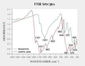 Hình 2: Phân tích FTIR cho thấy các đặc điểm hấp thụ ở 1167, 1077, 962, 853, 665, 587, 529, 476 và 433 cm–1 trong phần Jadeite (đường phổ màu đỏ) và ở 1001, 646, 557 và 460 cm–1 trong phần Serpentine (đường phổ màu xanh lục). |