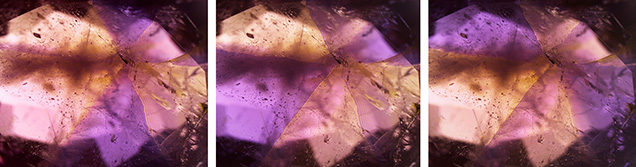 Hình 1. Viên Alexandrite 0.69 ct này thể hiện cấu trúc hình sao do song sinh vòng và đa sắc, tạo hiệu ứng kính vạn hoa khi xoay. Các ảnh hiển vi được chụp với một bộ lọc phân cực