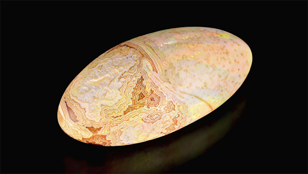 Hình 1. Viên Opal này từ vùng Shewa của Ethiopia, nặng hơn 10 carat một chút, cho thấy các vùng có vân giống Agate. Ảnh chụp bởi Diego Sanchez và Robison McMurtry. Gần đây, tác giả Stephen Challener đã mua