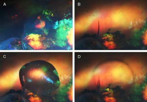 Hình 1: Opal hydrophane Ethiopia với một vết nứt nhỏ này đã được kiểm tra ở độ phóng đại 15x trong ánh sáng phản xạ (A). Môi trường chiếu sáng đã được thay đổi thành ánh sáng truyền trực tiếp bằng cách mở vách ngăn trong buồng sáng của kính hiển vi ngọc học (B). Một giọt nước được đặt trên bề mặt (C) và được đá hấp thụ tạo ra quang sai (D) nhằm xác nhận bản chất hydrophane của Opal. Lưu ý rằng nước cũng tạo ra quang sai rõ rệt hơn trong vết nứt. Ảnh của Nathan Refro. |