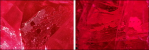 Gần đây, phòng thí nghiệm GIA tại Carlsbad đã nhận được một viên đá màu đỏ phớt tía, kiểu cắt hỗn hợp, hình trái tim, với độ trong mờ, nặng 8,57 ct cho dịch vụ giám định (hình 1). Kiểm tra viên đá thu được giá trị chiết suất là 1,760–1,769 và phổ hấp thụ đặc trưng của Ruby thu được bằng máy quang phổ cầm tay. Viên đá phát huỳnh quang màu đỏ có cường độ từ trung bình đến mạnh đối với bức xạ UV bước sóng dài và huỳnh quang màu đỏ với cường độ rất yếu đối với bức xạ UV bước sóng ngắn. Trong quá trình phân tích bằng kính hiển vi, một số vết nứt có chứa vật chất màu trắng và bọt khí được nhìn thấy bằng cách sử dụng đèn phụ trợ (hình 2). Bằng cách sử dụng ánh sáng phản xạ, các vết nứt có độ bóng thấp hơn độ bóng của Corundum cũng được quan sát thấy, điều này khẳng định sự hiện diện của vật liệu trám.